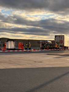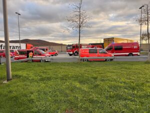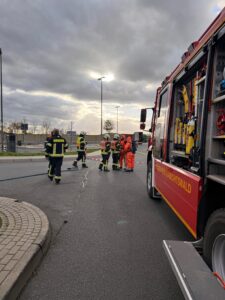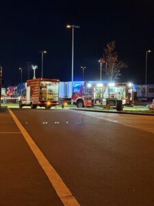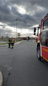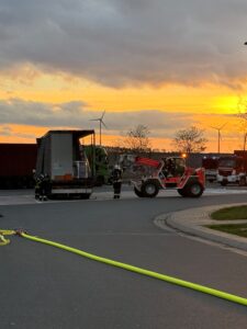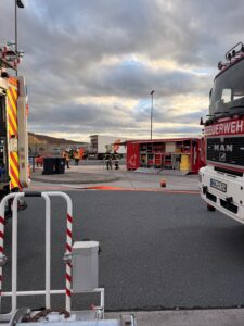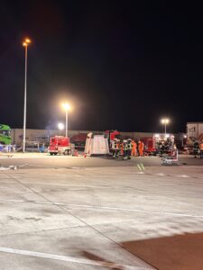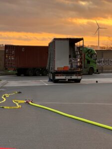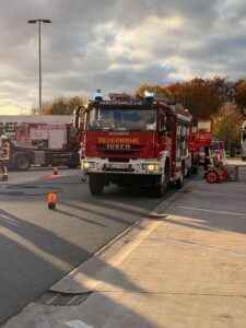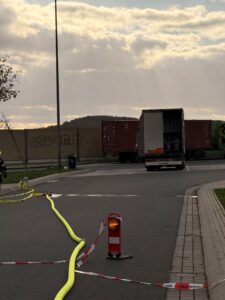 Gemeldet wurden auslaufende Gefahrstoffe aus einem LKW auf der A44/Raststätte Bühleck. Nach Ankunft sperrten wir den Gefahrenbereich ordnungsgemäß ab. Der Angriffstrupp rüstete sich mit Atemschutz aus. Der Brandschutz wurde aufgebaut und sichergestellt. Nach der Erhöhung des Einsatzstichwortes wurden weitere Spezialkräfte nachalarmiert. Es handelte sich um 2 kaputte Fässer hochkonzentriertes Zitronenöl – leicht entflammbar, nicht toxisch. Die komplette Beladung wurde abgeladen und auf einen anderen LKW umgeladen. Wir leuchteten die Einsatzstelle aus. Nachdem der Verladevorgang abgeschlossen war, konnten wir wieder einrücken.